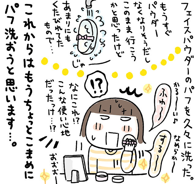 でもたまにパフ洗うと肌に当たる部分のふんわり感やするっとのびる感じとかが復活して、ほんと使い心地いい…!