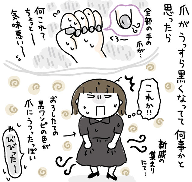 はじめはなぜ自分の爪が急に黒ずんでるのか意味がわからず、親戚の人にお茶とか出しつつ「なんだこれ!」と頭の中でぐるぐるぐる…。