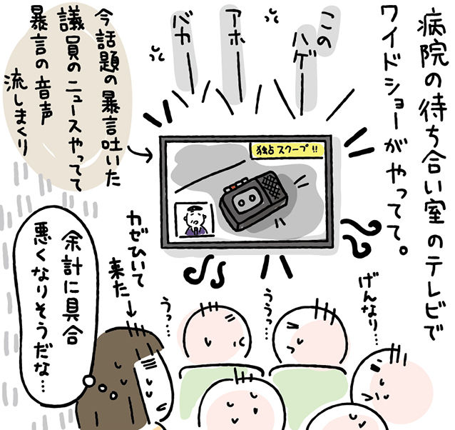 病院の待ち合い室だからすごく静かなので、その暴言の音声がひときわ響いてなんだか異様な空間になってました。