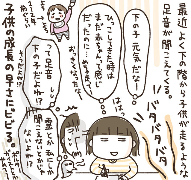 下の階から部屋をタターッと駆け抜けていくような足音がふとしたときに聞こえてくるのですが、きっと下の子のはず…。