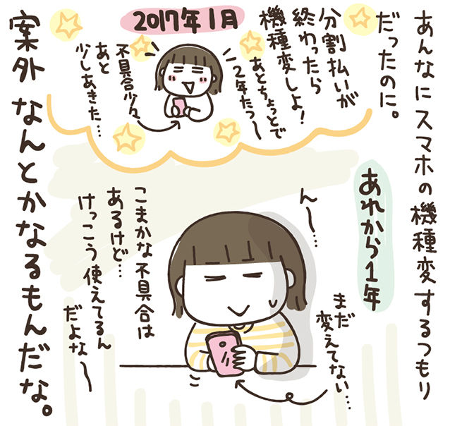 新しいスマホでさくさく操作したいっていう気持ちもあるけど、決定的に何か困ってるわけでもなく(容量がパンパンになってきたとか、電池の減りが早いとかかな〜)何かを我慢したり対策すればなんとか使えるっていうのもあって。
