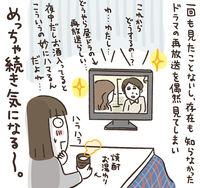 でも基本酔ってるテンションで見てるので、続き気になりつつも翌週の再放送は見逃すんですよね。