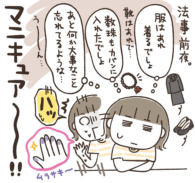 法事も時間にして10分ぐらいだったので私が紫のマニキュアしてても誰も気がつかなかったとは思うのですが、やっぱ自分が気になっちゃいますもんね。