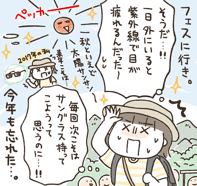 去年も同じ時期にフェスに行ってたのですが、そのときも本当に太陽すごくて目がめちゃくちゃ疲れちゃって…。