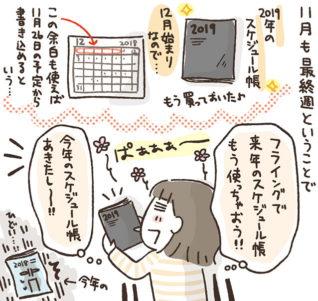 でももう11月も最終週だし、12月待たずしても12月のページの第1週の余白部分も使えば11月のラスト数日の予定ぐらいなんとか書き込めるなぁって。