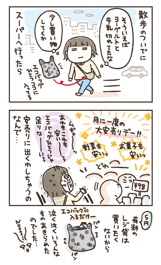 何があってもいいようにエコバッグをひとつはカバンに入れてるんだけど、でもバッグひとつじゃ足りないぐらい大物(大根とかファミリーパックのお菓子とか…)が安い時もあって、ほんと「なぜこのタイミング!?」ってスーパーで立ちつくしちゃう。