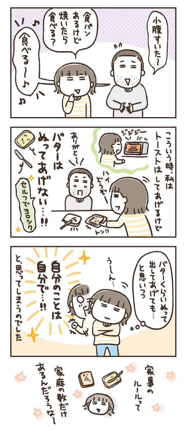 とりあえず私の家事ルールは、パンをトーストしてあげるとこまではギリギリOKなんですよね。