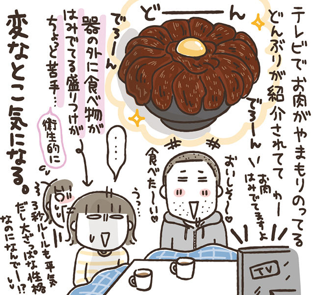 肉が器からはみ出てベロンと垂れてるぐらいの、すごいボリュームのどんぶりがテレビで紹介されてて。