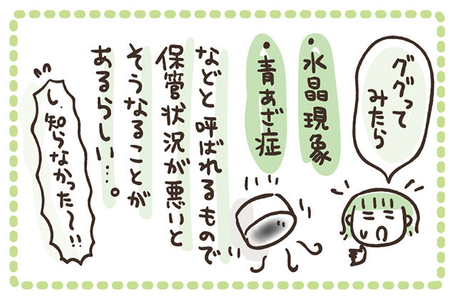 このサイトによると、水晶現象や青あざ症だった場合は病気ではないので食べても問題はないそうだけど、味は落ちるみたいですね。