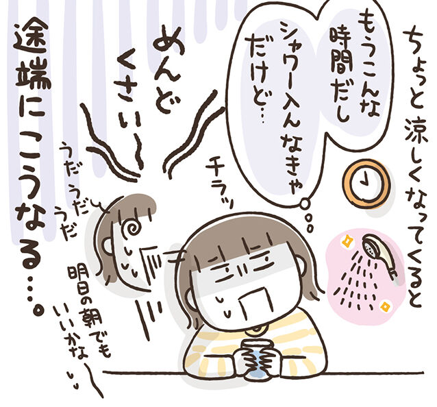 ってことで一気に気持ちに緩みも出てきて、夜シャワーに入るのがめちゃくちゃめんどくさくなっちゃいます。