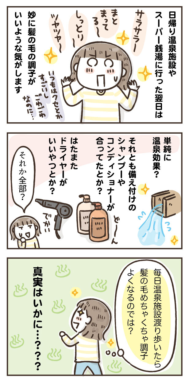 っていうことは、連日違う温泉施設やスーパー銭湯に行って、お風呂はいって髪の毛洗ってドライヤーすれば、毎日毎日髪の毛サラサラのつやつやなのでは!?