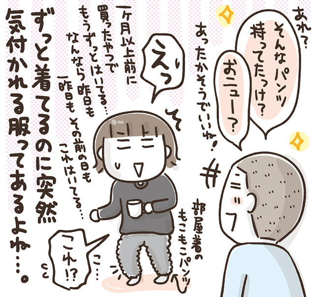 本人にとっては普通にもう何回も着てる服でも、家族にはなぜか目に入ってなくて、でもある日突然「あれ?なんか見たことない服着てるな!」って家族にも見える瞬間が来るのがほんと不思議でおもしろい。