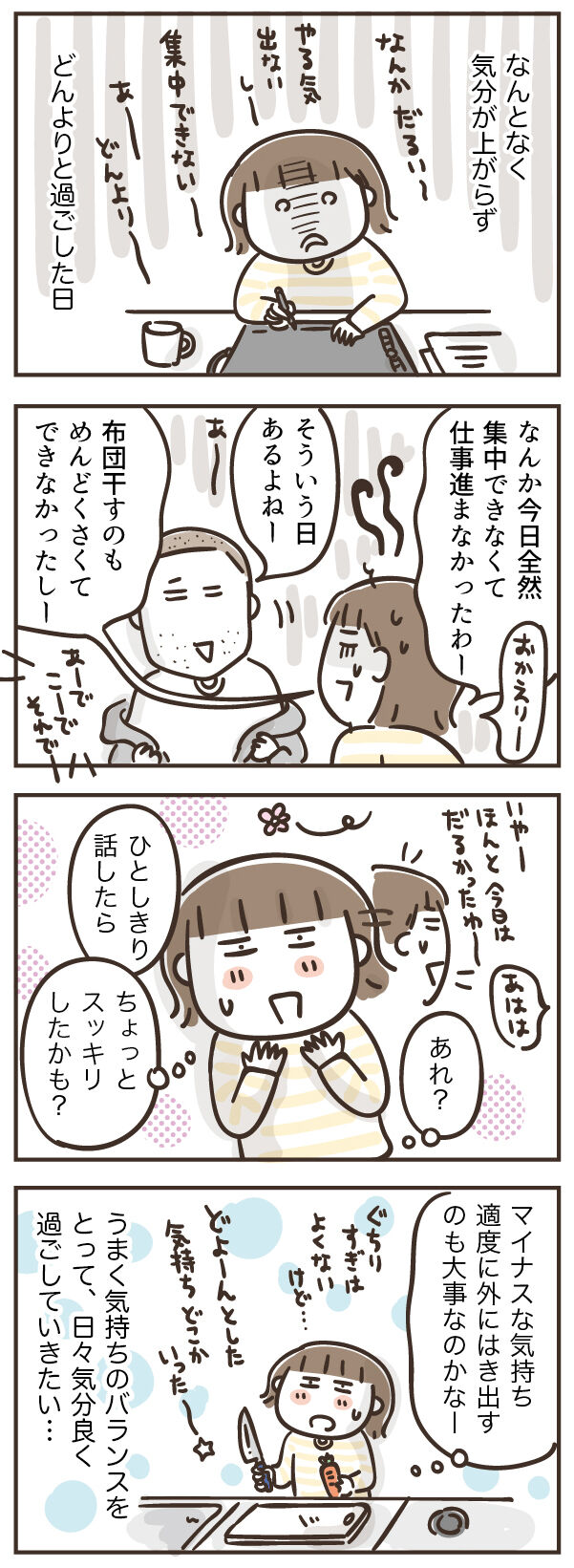 愚痴りすぎも良くないですが、どんよりした気持ちを言葉にして外に出すって大事なのかなーと。