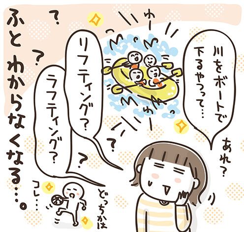 冷静に考えるとなんとなくわかるんですけど、テレビとか見てて川をボートで下るアクティビティの映像が流れたりすると、その話をしたくて「あれ!川下るやつ!えーっと、リフティングだっけ?ラフティングだっけ?」って感じで、咄嗟だと本当にわからなくなってしまうのですよね。