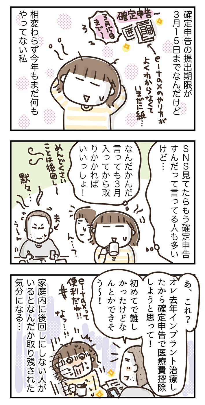 SNSで「確定申告終わった!」っていう書き込みを見ると「早い人すごいな!まぁでも3月から取りかかってもなんとかなるなる!」って思えるけど、家庭内に早めに書類仕事に取りかかる性分の人がいると、落ち着いていられないですね…。