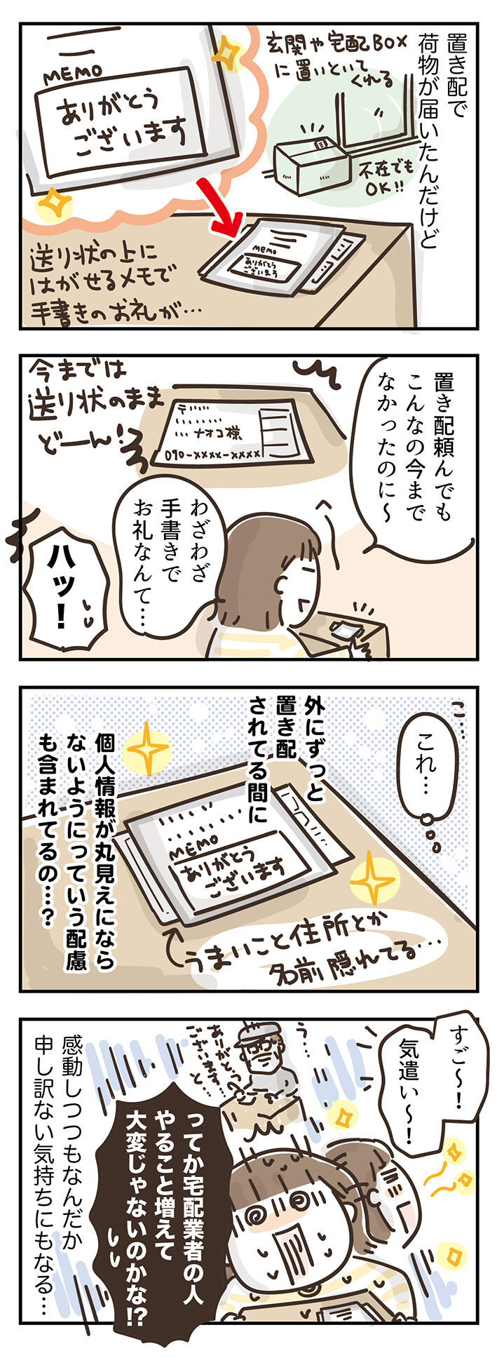 置き配の荷物の送り状の上にきれいにはがせるメモがピチーッと貼り付いてて、住所とかが見えないようになってて、手書きのお礼の言葉もあって。