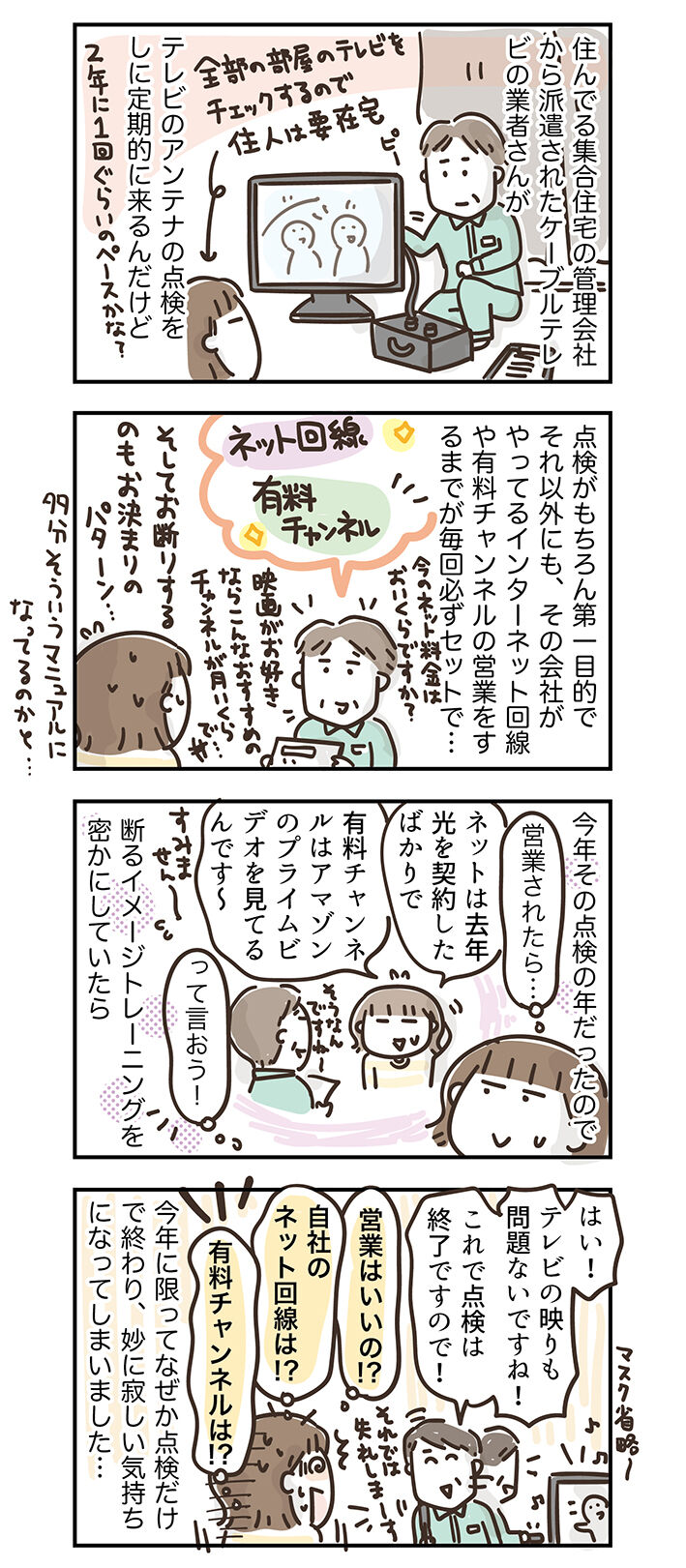 なにはともあれ、てっきり今回もお馴染みの営業タイムがあると思っていたから、訪問前に「ネットは去年光にしたばっかりっていうのを言って…。有料チャンネルはアマゾンのプライムビデオ観てるって伝えて…。」って感じで脳内で断るときのイメージトレーニングをしてたから、なんだかもう拍子抜けで。