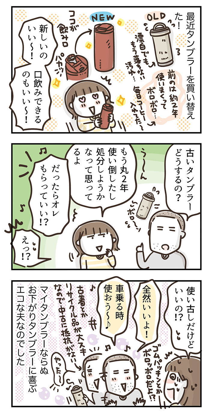 私だったら、いくら家族でも二年使い倒したタンブラーを引き継ぐのはちょっと躊躇するかなって思うのですが(それぐらい使った感出てる)、リサイクルものが大好きな夫は全然抵抗がないようで。