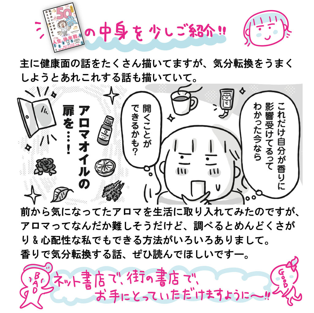 50歳手前で起こった体の変化や気持ちの移り変わりを描いてまして、気になる不調をなんとかしようとしたり気分転換してみたり、あれこれやってる一冊です。