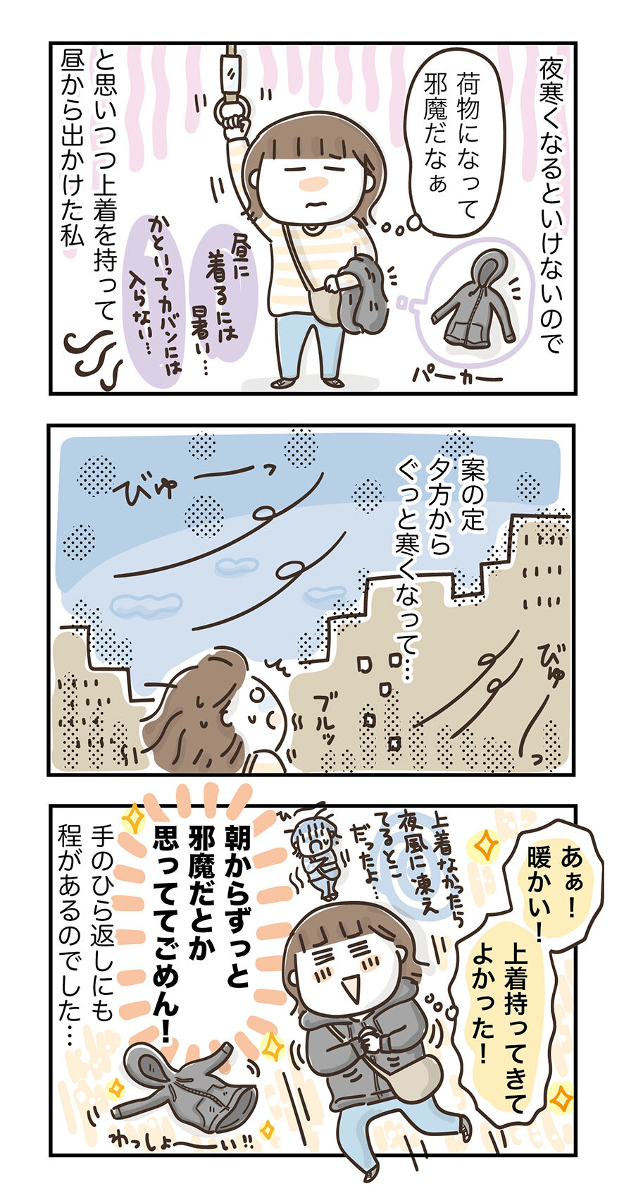 実はそんなに気温下がらないんじゃないの?今着てる長袖でなんとかなるんじゃないの?と、後悔にも似た気持ちでいっぱいになってしまいます。
