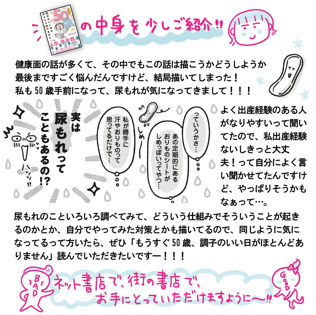 ぜひネット書店で、街の書店で、「もうすぐ50歳、調子のいい日がほとんどありません」をお手にとっていただけますように〜!