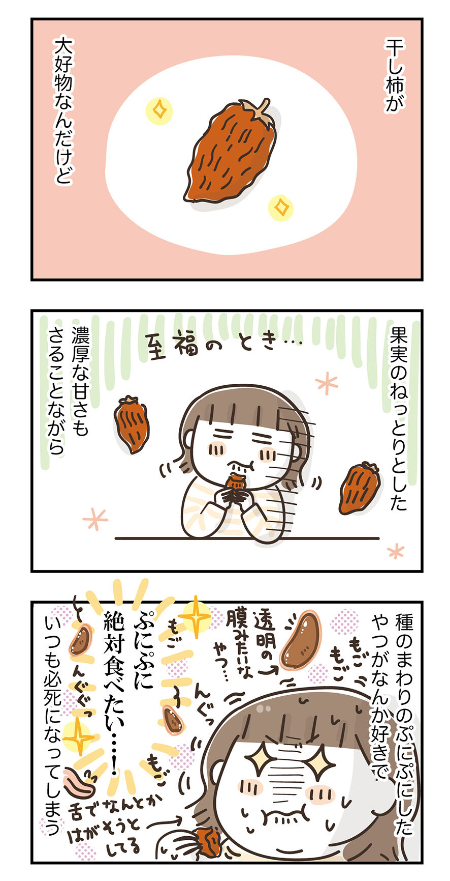 干し柿が大好きなのでよく食べるのですが、干されて果実の甘みがぎゅっと詰まったとこももちろん大好きなのですが、種のまわりのぷにぷにもなんだかよくて!