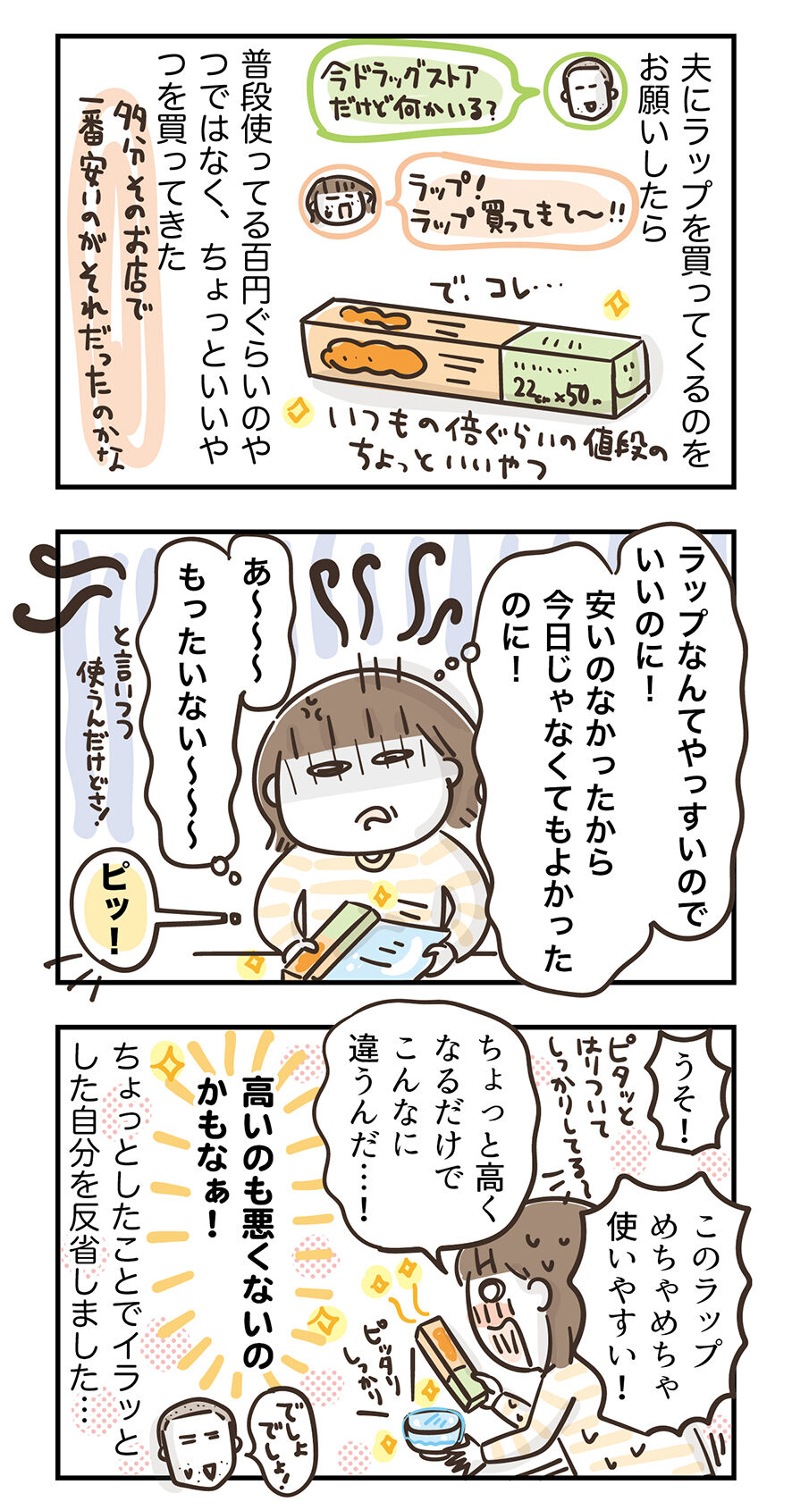 いつも100円台のラップを買ってるのですが、夫に頼んだら200円台の買ってきて、たかが100円高かったぐらいの話なんですけど、その時はなんだか内心イラッとしてしまって…。