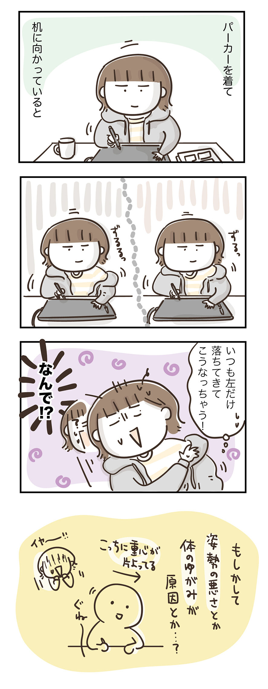パーカーを着て机のむかってると高確率でこうなってしまうんですけど、やっぱりこれって姿勢の悪さとか体の歪みが原因なんですかね…。