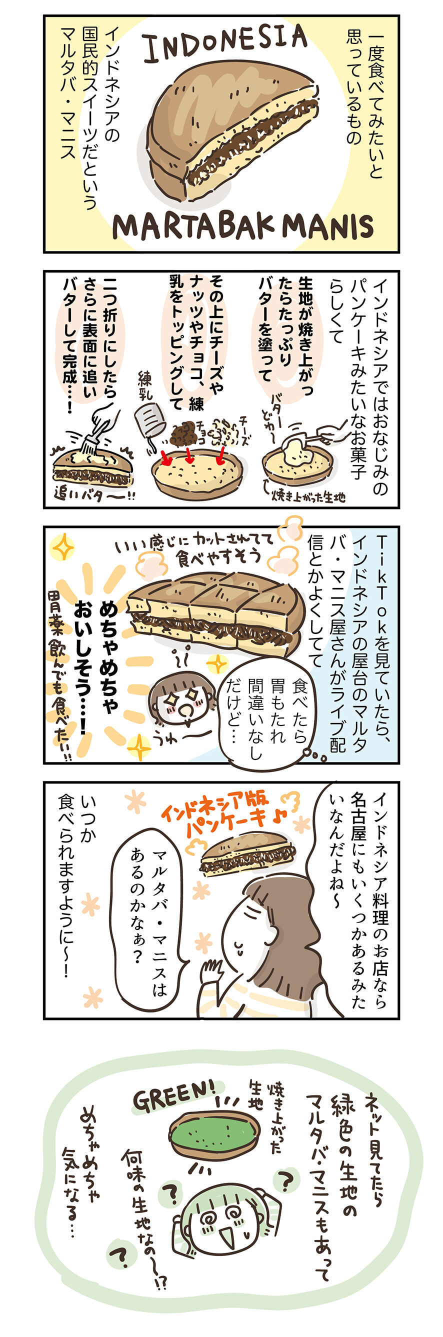 ネットでいろいろ検索してみたところそのスイーツらしきものは、インドネシアの国民的お菓子でパンケーキみたいなもので、正式名称はマルタバ・マニスというそうです。
