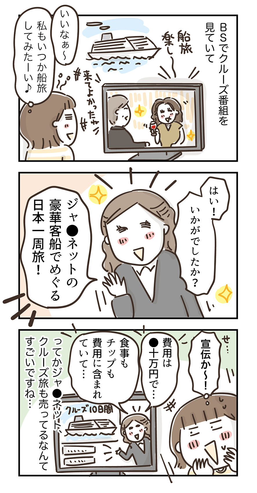 それでその日も普通にクルーズ番組やってて「いいな〜♪」なんて旅気分を味わいながら見ていたのですが、突然大手の通販会社がそのクルーズ旅行を紹介し始めて!