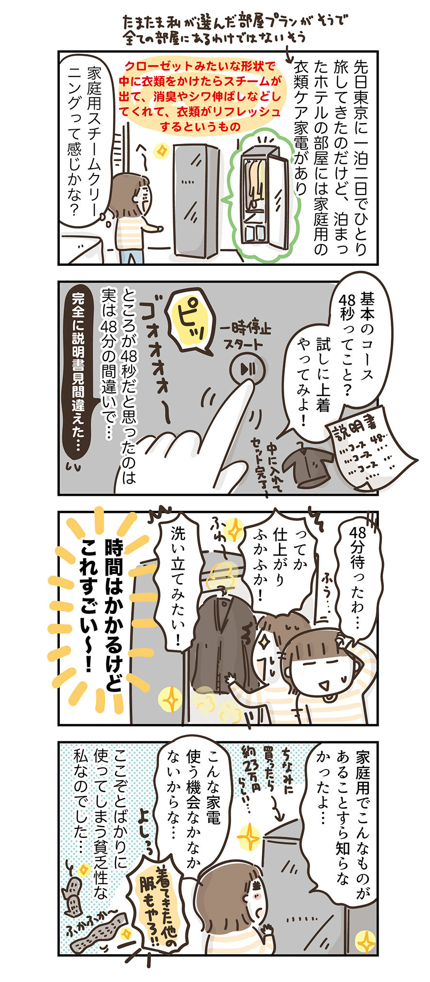 止まったホテルはめちゃ安でもないけど高いってわけでもなく、ほんと普通ランクのホテルだったのですが、先日の絵日記にも描いたように備品にリファの美顔器やドライヤーがあったり、今日の絵日記にも描いたように家庭用のスチームクリーニングがあったりと、なかなか好奇心をくすぐられる部屋でした。