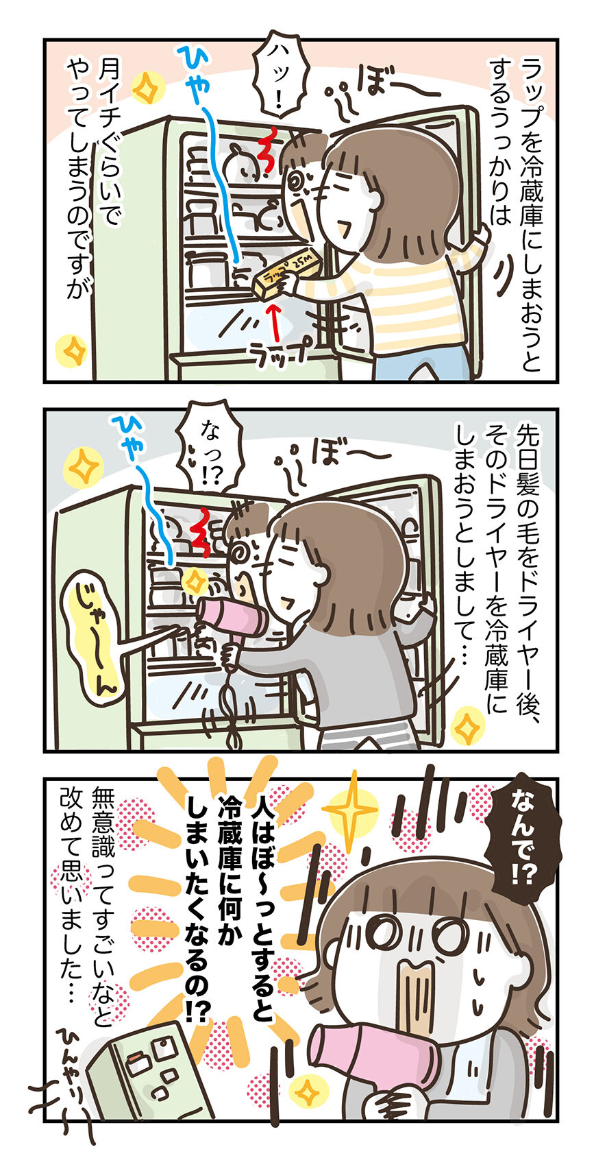 でも先日初めてこのパターンでドライヤーを冷蔵庫にしまいそうになって、冷蔵庫の扉開けたまま自分で自分がわからなくなってしまいました。