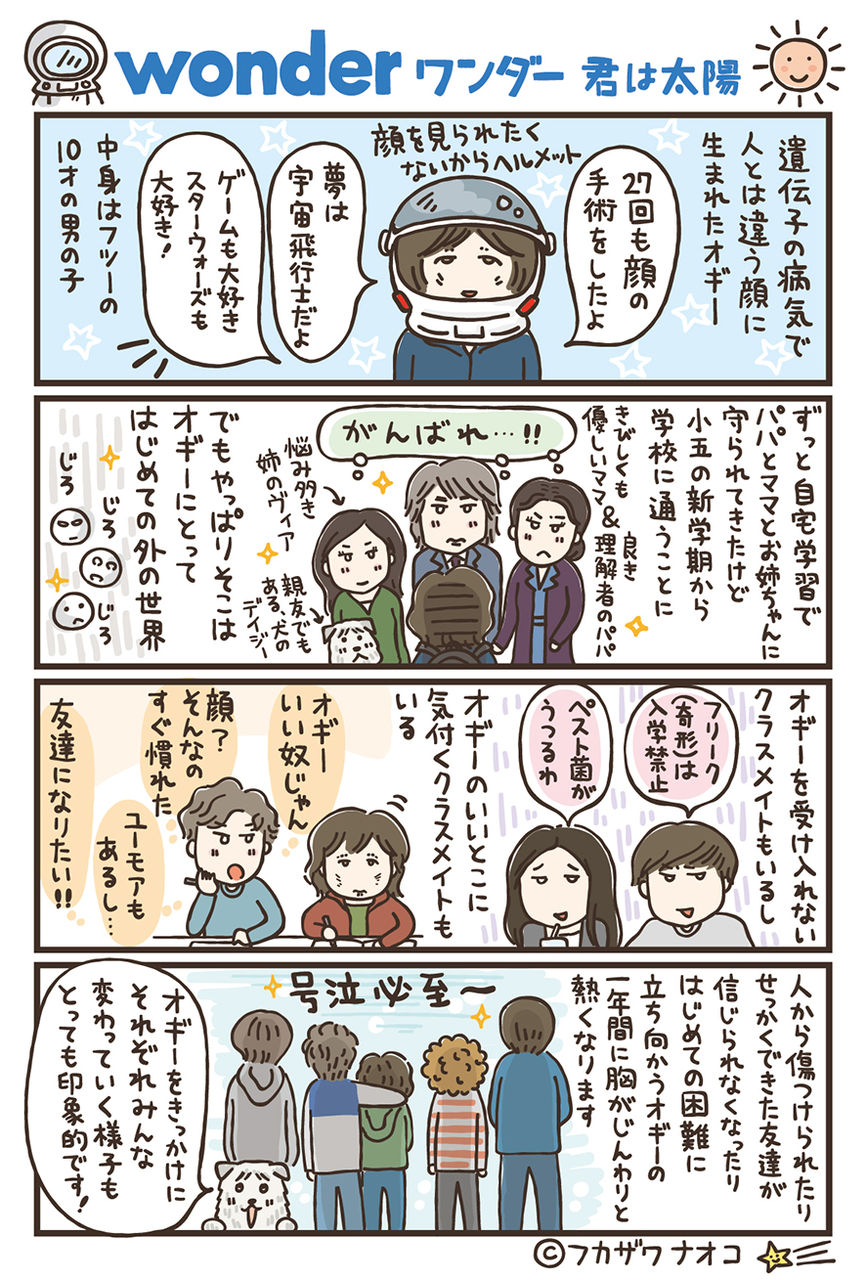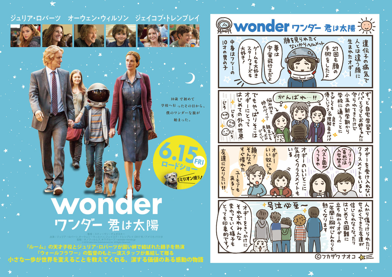 TOHOシネマズなどで全国公開された映画「ワンダー 君は太陽」の告知4コマ漫画を描かせていただきました。
