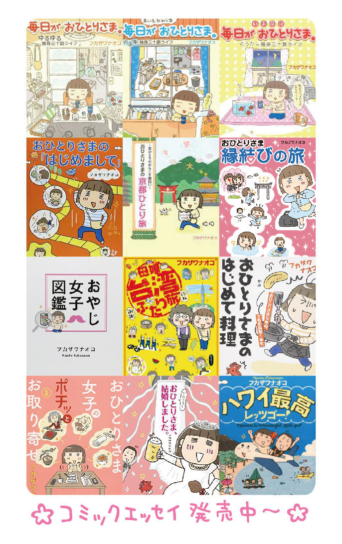 独身、彼ナシ、金ナシの楽しくも切ない毎日をつづったコミックエッセイ 「毎日がおひとりさま。」がシリーズ化され、台湾や中国でも翻訳され、以後継続してコミックエッセイを執筆し現在に至る。